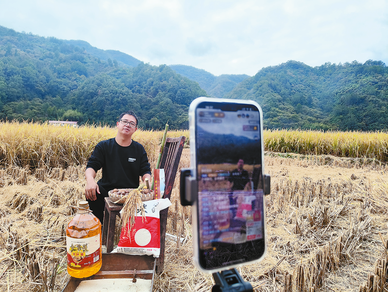十月十五日,在镇安县月河镇水稻基地,带货主播正在介绍镇安特产。近年来,随着电商的兴起,越来越多的网络达人把直播开到了田间地头,让商洛农产品走出陕西,为千家万户知晓,同时也宣传了商洛的历史文化,提高了知名度和影响力。(本报通讯员 杨建东 摄)