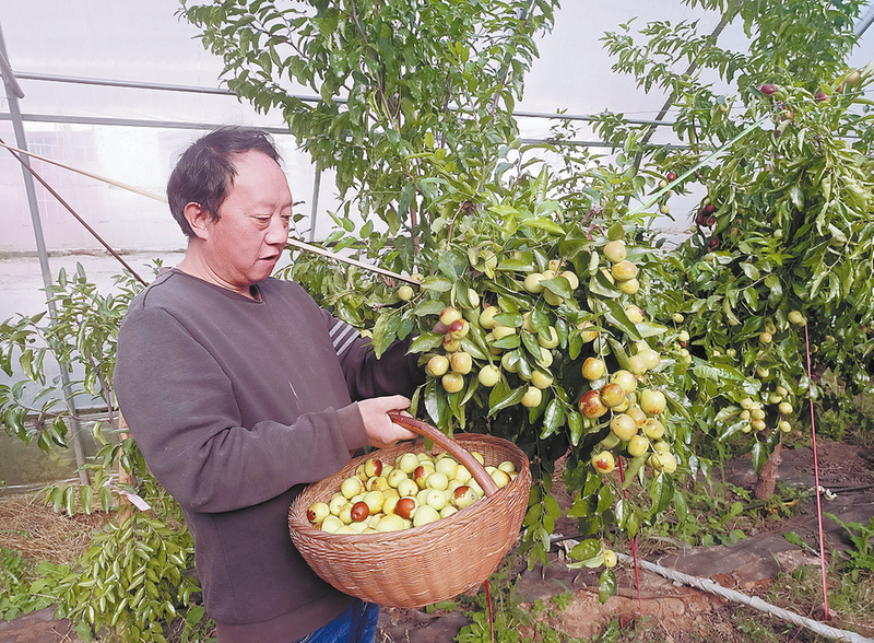 10月14日,丹凤县铁峪铺镇化庙村群众在采摘冬枣。该村发展大棚冬枣30亩,已有15亩挂果,今年收获冬枣2600多公斤,群众增收4.1万元。 (本报记者 贾书章 摄)