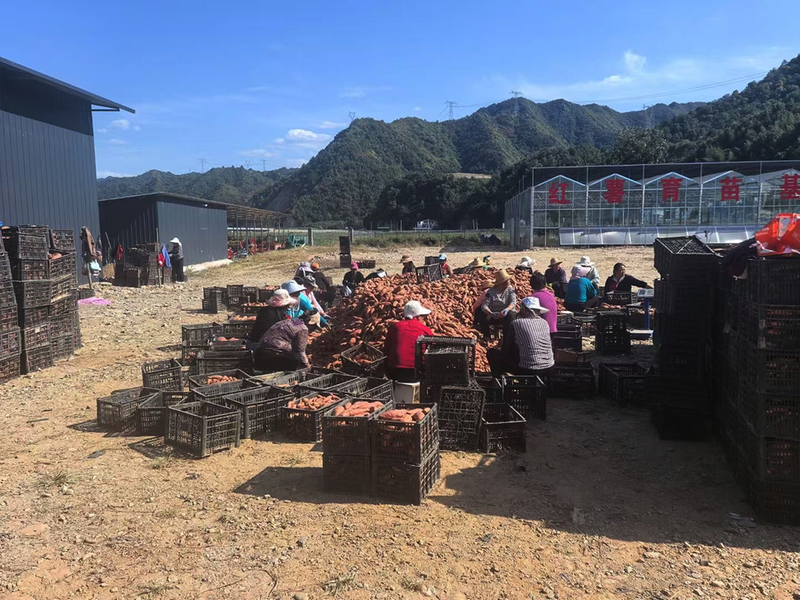 在秦岭蜜薯种植基地,随着挖薯机在田埂间来回穿梭,翻滚的泥土中,一颗颗红润诱人的红薯纷纷探出头来,务工群众正在给新出土的蜜薯去泥、分拣、装箱,一堆堆刚出土的红薯摆满田间地垄,个个体态饱满、颜色鲜艳,煞是喜人。田间呈现一派繁忙丰收景象。蜜薯晾晒一个小时后,按照大小规格进行初步分级——小薯、中薯、大薯装入纸箱,然后装车运往仓库,发往全国各地。