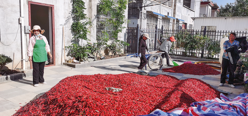 今年以来,洛南县保安镇黑潭村紧紧抓住产业兴农不放松,鼓励群众发展辣椒产业促增收。据介绍,该村今年种植辣椒100多亩,每亩地收获辣椒约1500公斤,增加了当地群众经济收入。图为近日群众晾晒辣椒。 (本报通讯员 杨开让 摄)