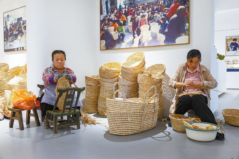 10月17日,洛南县保安镇非遗一条街巧手草编馆内,工人在编织摇篮和收纳筐。近年来,洛南巧手草编工艺品公司在洛南、商州等地开设20多个草编生产基地,生产以玉米苞叶为主要原料的草编工艺品,辐射带动易地搬迁群众、留守妇女、残疾人等在家门口实现就业增收。 (本报记者 党率航 摄)