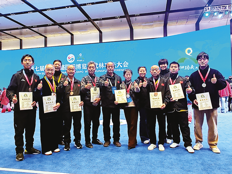 2023年11月16至20日,常进全(左六)带领商洛武术代表队参加第七届丝博会武林功夫大会,获得3枚银牌6枚铜牌,11人获得优秀奖。“只要能通过我们的付出,让大家身体更健康,那我们再累再苦都值得。”10月12日,常进全笑呵呵地说。