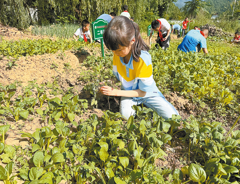10月13日,丹凤县铁峪铺镇中心小学二年级学生在劳动实践教育基地除草。近年来,铁峪铺镇中心小学坚持“以基地为载体,体验育人,创建特色学校”的劳动教育思路,把学科教学活动向基地延伸,增强学生动脑和动手相结合的能力,培养学生全面发展。 (本报记者 马泽平 摄)