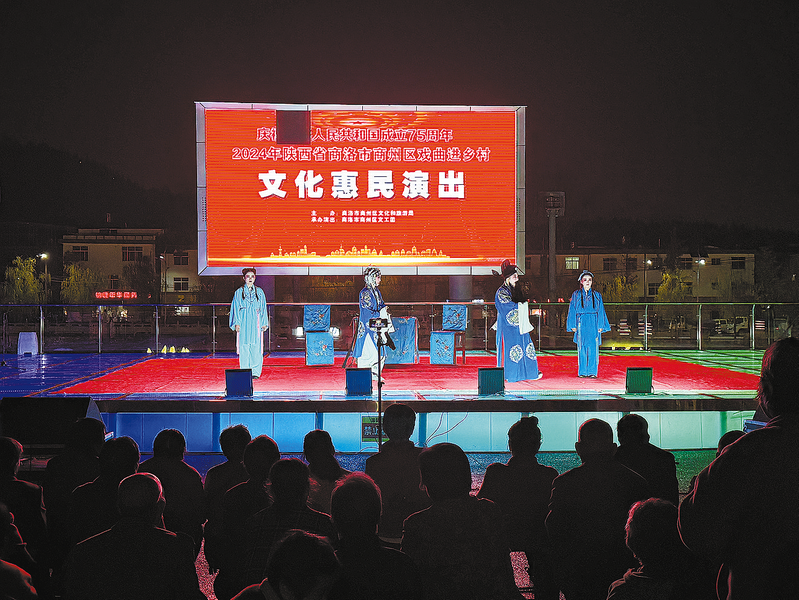 今年以来,商州区持续推出“周周有戏看”文化惠民活动,由区文工团及50多个民间剧团共同参与,在城区公园小舞台和社区文化广场轮番上演,目前已累计举办136场文化惠民演出。图为10月18日晚,商州区文工团在南秦河生态公园演出。 (本报记者 张 英 摄)