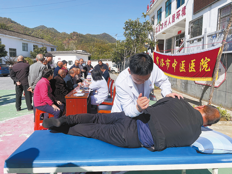 10月23日,商洛市中医医院在商南县金丝峡镇二郎庙村开展义诊活动。在现场,医护人员为村民量血压、测血糖、针灸、推拿等诊治,并为村民免费发放5000多元的药品,让村民在家门口就能享受到便捷的医疗服务。 (本报见习记者 潘 磊 摄)