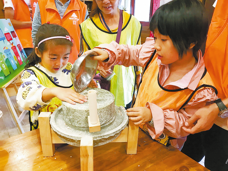 10月19日,在镇安县青铜关镇丰收村的丰收农场内,小朋友在手工制作中心磨豆浆。丰收农场是该村的新时代文明实践基地,建设过程中利用闲置土地建成包含有植物认知区、动物认知区、手工制作中心、农耕文化体验地等区域科普认知基地。 (本报记者 南 玺 摄)