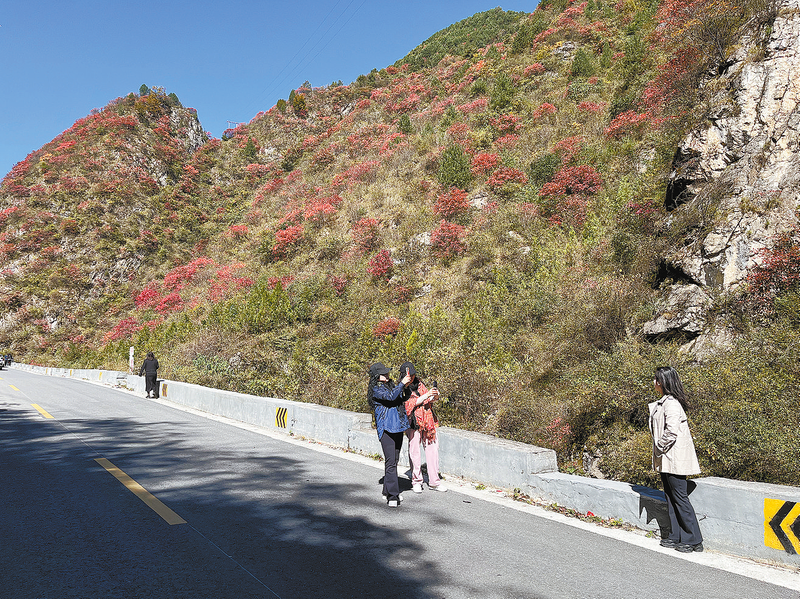 连日来,商州区牧护关镇101省道上的“秦岭峡口红叶”景点呈现出五彩斑斓、灿若烟霞的美景,吸引了大批西安和本地市民前来感受商洛美丽秋景。 (本报记者 谢 非 摄)