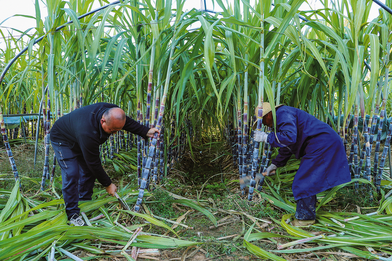 10月22日,工人在洛南县四皓街道柳树洼村生态农业示范园的甘蔗地里采收甘蔗。据了解,该村甘蔗园实现亩均产收甘蔗3000株,亩均产值3万元以上。同时,还吸引了不少游客前来采收品尝。