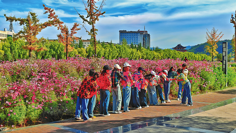 近日,市区丹江河南岸滨江银杏公园内连片的格桑花绚丽绽放,在蓝天白云的映衬下,形成了一道美丽的风景线。图为10月24日,盛放的格桑花吸引了大批市民和游客前来拍照打卡。 (本报记者 杨 鑫 摄)