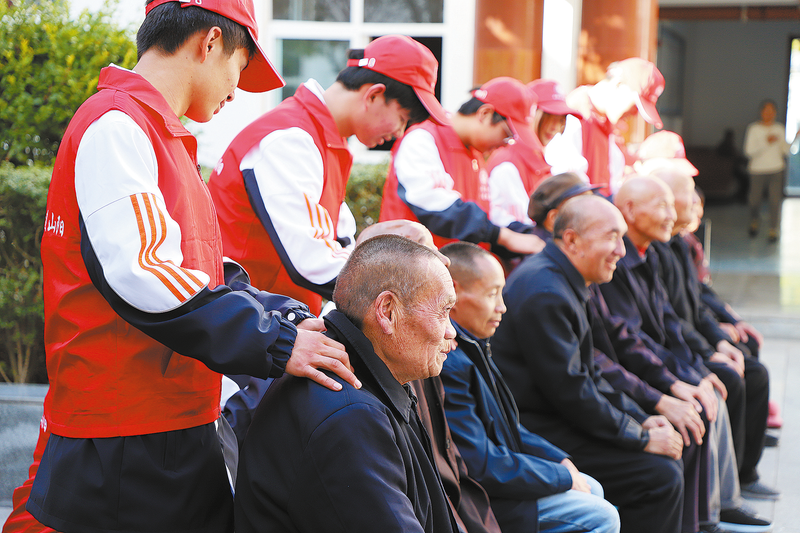 为传承孝亲敬老传统美德,10月23日,山阳县职教中心师生深入县社会福利中心开展以“关爱长者,构建老年友好型社会”为主题的志愿服务活动。图为该校护理专业的学生正在为老人做保健服务。(本报通讯员 张弘沛 摄)