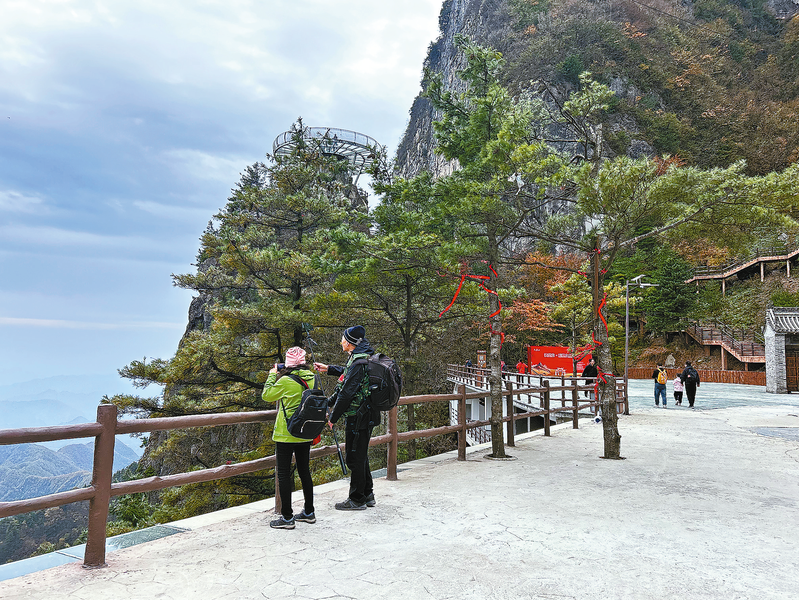 金秋时节,秦岭天竺山景区漫山遍野的树叶由绿转黄、由黄转红,色彩斑斓,微风拂过,仿佛徜徉于旖旎画卷,吸引了大批游客前来游览观赏。图为10月26日,游客在天竺山景区观赏红叶、拍照打卡。 (本报记者 黄朝梅 摄)