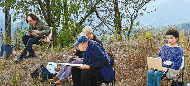 近日,黄土画派、秦岭画派、商洛学院艺术学院写生基地在商州区金陵寺镇熊耳山村挂牌,并开展了为期三天的采风活动。图为十月二十五日,画家在熊耳山村令人陶醉的秋色中沉浸式写生。 (本报记者 肖 云 摄)