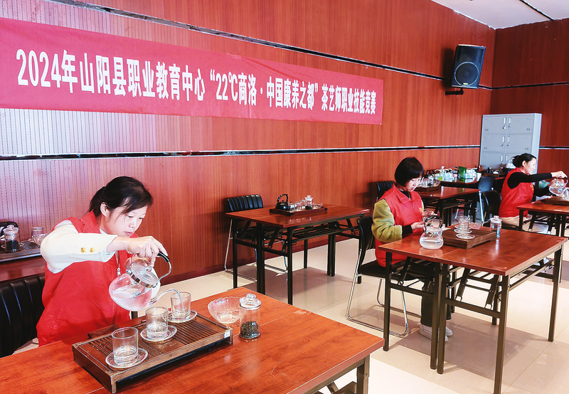 近日,山阳县职教中心举办茶艺技能培训,培训为期十天,采取“理论+实操+工作场地岗位培训”的方式,共有五十名群众报名参加。培训结束后进行统一理论和实操考试,为成绩合格的学员颁发证书。图为学员现场进行茶艺实操。 (本报通讯员 张弘沛 摄)