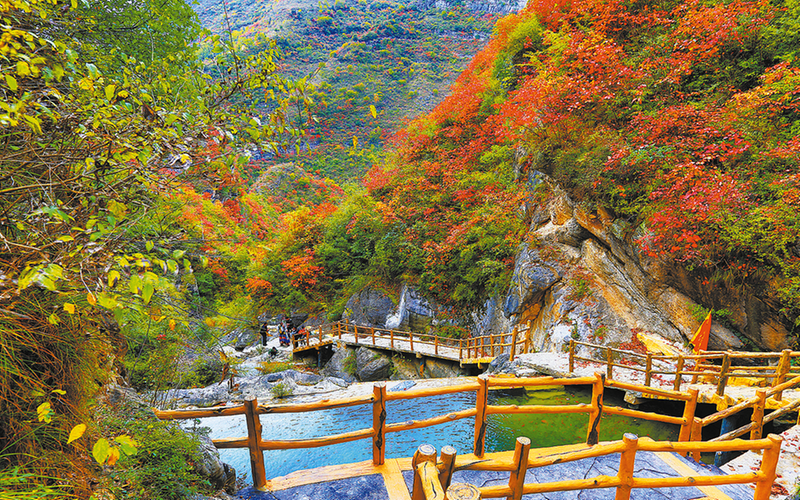 在洛南溪乐谷景区,漫步在山野之间,山水相依,红叶在枝头翩翩起舞,是与自然亲密接触的理想之地。