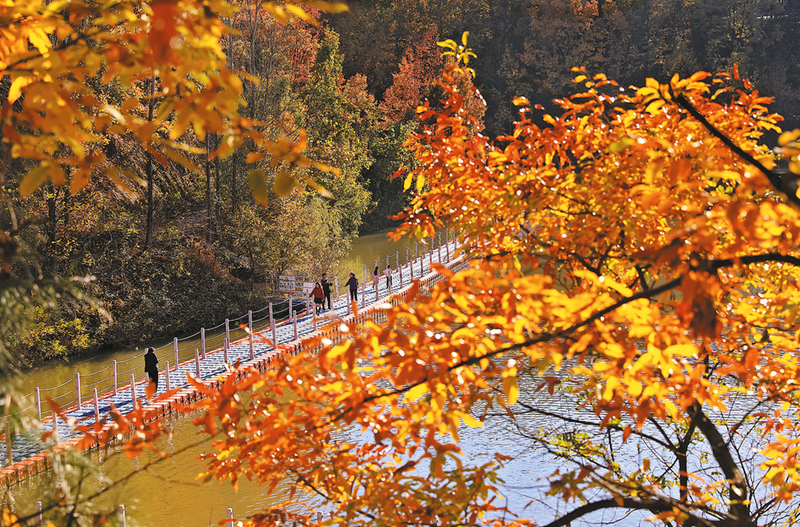 11月2日,位于洛南县四皓街道的抚龙湖,山间树叶呈现出金黄与火红的斑斓色彩,碧绿的抚龙湖水与明净的蓝天遥相呼应,景色宜人,吸引游客前来拍照打卡,体验扶龙湖迷人的秋色。 (本报通讯员 陈亚民 摄)