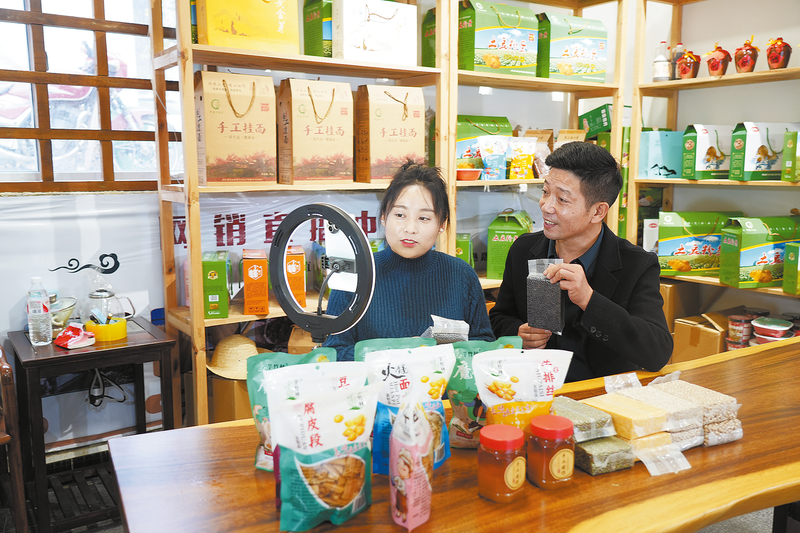 近年来,丹凤县竹林关镇王塬村抢抓机遇,积极打造电商中心,通过直播平台,将本村的手工挂面、红薯粉条、土蜂蜜、香菇等农副产品销往外地,带动村集体经济发展壮大。图为10月26日,网红达人“丰阳熊哥”在王塬村电商中心助力直播带货。 (本报通讯员 王 磊 摄)