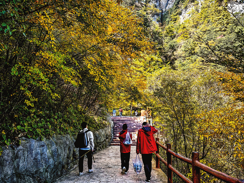 在第一个观景台,摄影爱好者李先生正和几个伙伴手持相机,捕捉着天竺山秋日的美景。他说,这次他与几位朋友结伴从西安过来,天竺山的云海与山峰给他们留下了深刻的印象。在以往的旅行中,很少有机会目睹如此高海拔的山峰,漫步于此仿佛置身于原始森林,空气格外清新,令人陶醉。