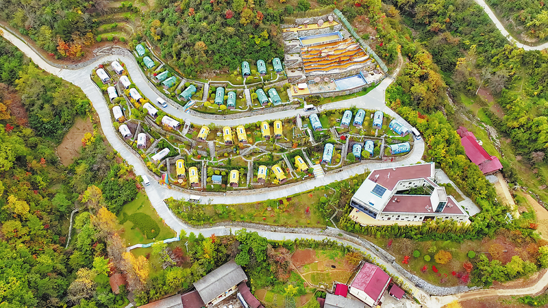 10月末,镇安县青铜关镇丰收村迎来一批批游客前来赏秋游玩。空中鸟瞰,村内道路阡陌纵横,串联起山腰上的特色民宿罐罐屋及山脚的农家小院,远处青山绿树换上彩色的盛装,山下沿线田园、树木、小院互相托衬,别有韵味。游人、观光车穿梭其中,宛如人在画中游。(本报通讯员 陆 波 摄)