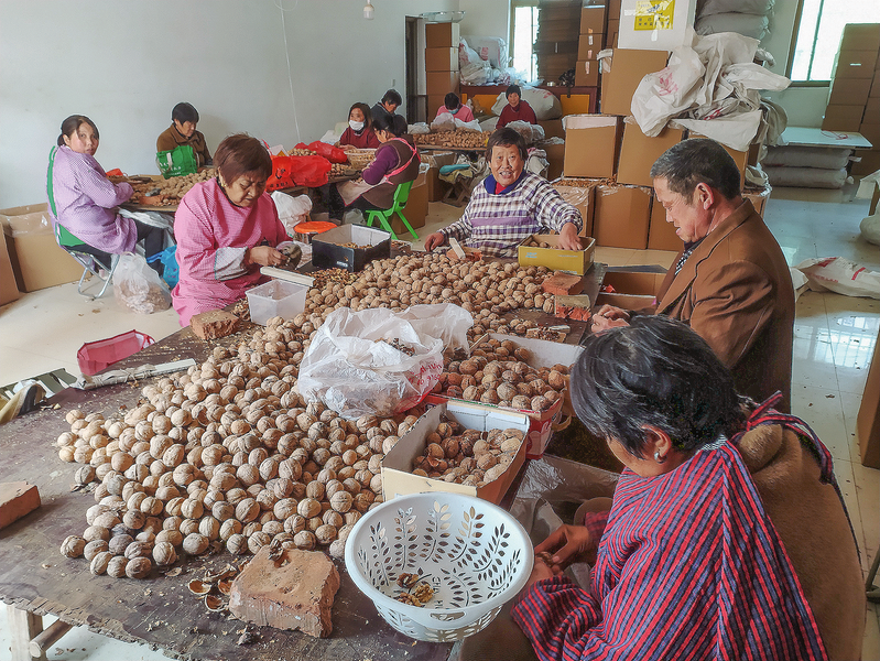 11月7日,丹凤县土门镇土门村核桃仁加工户刘文军雇请本村妇女在砸剥核桃仁。刘文军家年加工核桃仁100多吨,秋冬季每天雇佣40多名妇女加工核桃仁,每人每天收入40元至70元。 (本报记者 贾书章 摄)