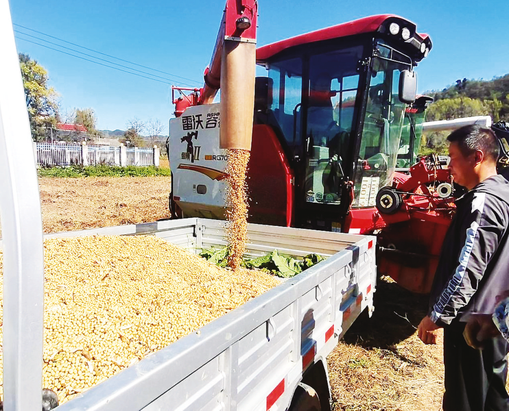 收获大豆近日,在洛南县石门镇大豆种植区,成片的豆叶在阳光下闪闪发光,饱满的豆荚中,黄豆偷偷探出了小脑袋。伴随着隆隆响声,收割机在田间来回穿梭,沉甸甸的豆荚转眼间被卷进收割台,圆滚滚的黄豆从机器中跳跃而出,仿佛向人们诉说着今年的好“丰”景。