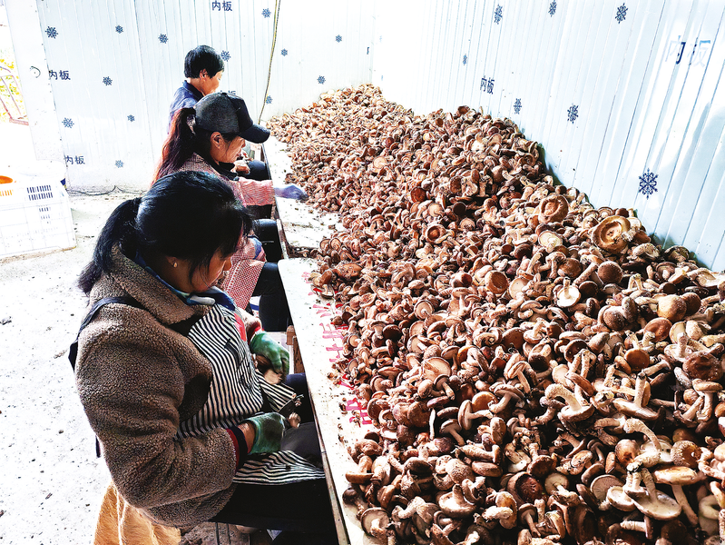 近日,丹凤县竹林关镇王塬村食用菌大棚内,务工人员正在分拣香菇。据悉,今年王塬村已种植食用菌15万袋,净利润在50万元以上,户均增收2800元左右。 (本报通讯员 赵书苑 摄)