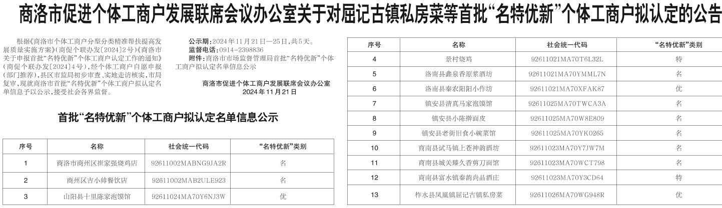 商洛市促进个体工商户发展联席会议办公室关于对屈记古镇私房菜等首批“名特优新”个体工商户拟认定的公告