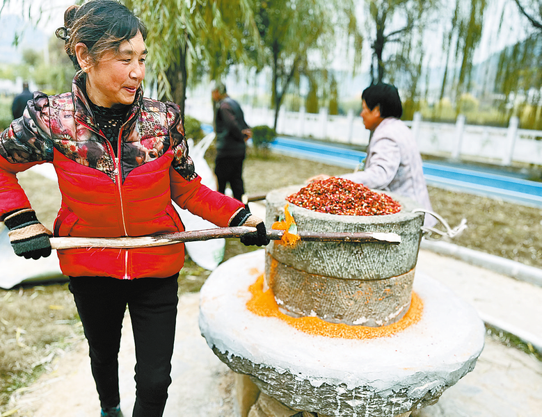 12月3日,在丹凤县竹林关镇丹水社区河堤运动公园内的石碾子上,村民正排队碾辣椒面。今年以来,竹林关镇对江北新区河堤公园基础设施进行改造提升,不仅为群众提供了休闲娱乐场地,也为群众生活提供了便利,提升了城镇品质。 (本报通讯员 王 蒙 摄)