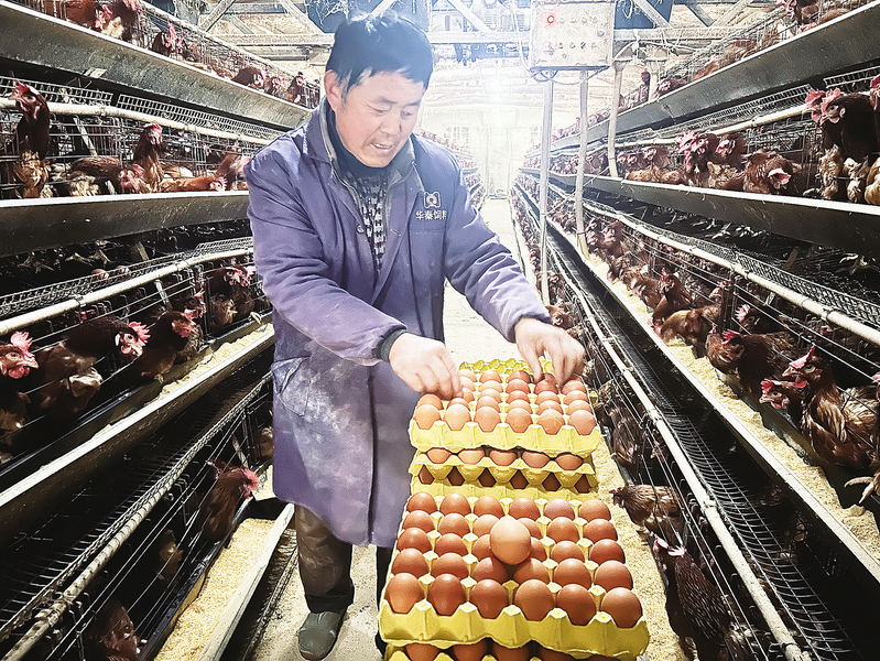 12月5日,在洛南县石门镇张湾村8组开心家庭农场内,李运杰正在捡拾鸡蛋。据悉,该农场养殖蛋鸡7000只,每天产蛋约400公斤,销往西安等地的农贸市场。 (本报记者 肖 云 摄)