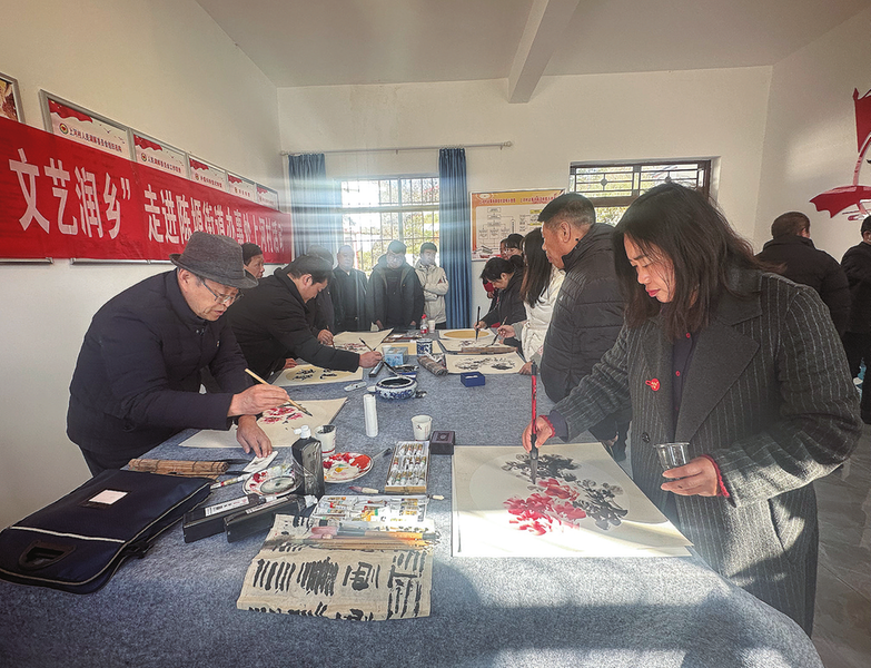 11月28日,商州区委机关工委、区文联在陈塬街道上河村开展“党建引领 文艺润乡”主题党日活动。区机关工委、区文联、区级各协(学)会负责人、书画家等50多人参加活动,参观学习上河村“上河驿”农业产业基地党建引领农村乡村振兴产业发展情况,进行党建元素主题书画创作及党史故事分享。 (本报记者 王孝竹 摄)