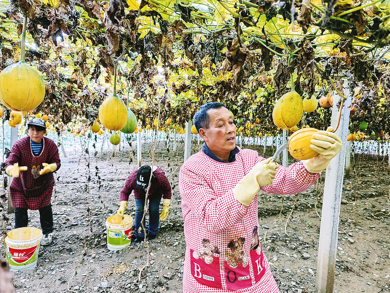 在技术员和村干部的全程跟踪服务和定期“把脉问诊”下,目前,一个个黄澄澄、圆鼓鼓的瓜蒌挂满藤蔓,惹人喜爱。瓜藤下,随处可见工人繁忙的身影,有的忙着割瓜皮,有的忙着取瓜瓤,有的忙着装车运输……望着装满瓜瓤的车辆被送往产业园,村民个个脸上洋溢着丰收的喜悦。