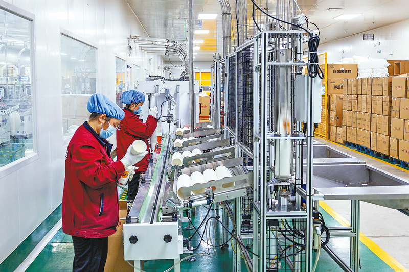12月4日,在陕西东勋新材科技实业有限公司生产车间里,工人正在赶制食品用环保新材料容器订单。该项目位于商州区医药食品产业园,主要生产可降解纸质容器、餐饮包装、药品包装等产品,目前项目已进入试生产阶段,达产达效后预计年产值2.3亿元,创造就业岗位200个。 (本报记者 党率航 摄)