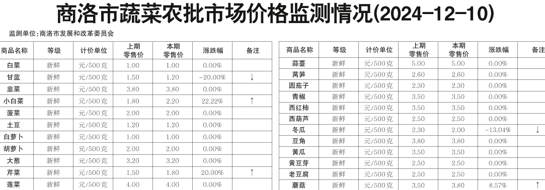 商洛市蔬菜农批市场价格监测情况(2024-12-10)