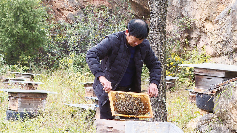 近60岁的张振峰是后坪村的养蜂大户,养了4年蜂,养蜂技术也很成熟,他不仅自己养蜂,也带动其他村民一起养蜂,并无偿传授养蜂技术。“其实养蜂很简单,它是低成本高收入,每箱蜂子一年按成品蜜、标准蜜走向市场就是在10斤左右,这就是高品质、口感好、浓度香的蜂蜜。”说起养蜂,张振峰信心满满,侃侃而谈。