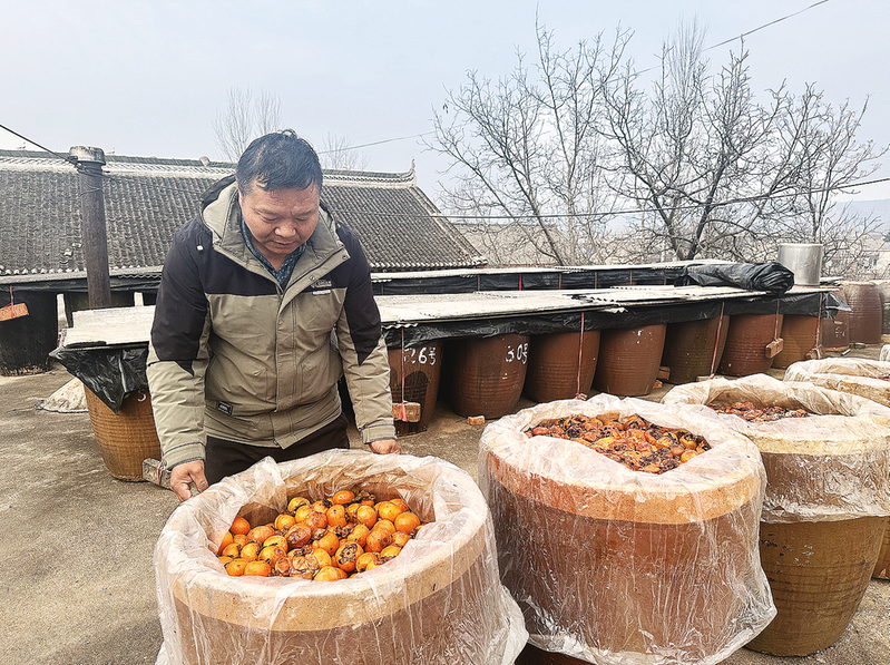 “每年霜降过后,将收购的柿子倒入大缸中密封,使其自然脱涩、发酵变甜、软化出汁,待来年清明前后,过滤出柿子汁进行酒精发酵,一周后酒精发酵完全后,加入醋曲封缸,再经日晒夜露自然发酵成醋,麦收前后开缸出醋,此时醋汁清如水、亮如油,再经过陈酿、过滤、灭菌、装罐,就可以销售了。”说起柿子酒的制作,王春敏驾轻就熟。