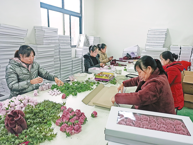 十二月十三日,在位于洛南县四皓街道抚龙湖社区的商洛德润宝实业有限公司生产车间内,工人正在加工香皂花。据了解,该公司集外贸香皂花、PE花、草编、塑编花篮系列工艺品开发、加工、销售及技能培训于一体,目前已为周边群众提供就业岗位一百多个,带动居家就业二千多人。(本报通讯员毕波波 摄)