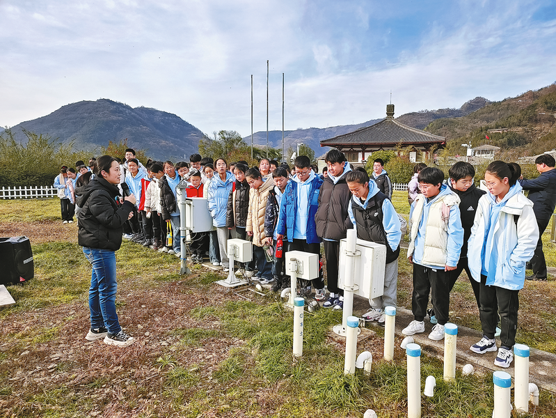 日前,镇安县初级中学一百一十多名学生走进镇安县气象科普教育基地,开展“探索气象奥秘感受科学魅力”主题研学活动,让学生在学习气象知识的同时培养探索精神。 (本报通讯员 蔡江萍 摄)