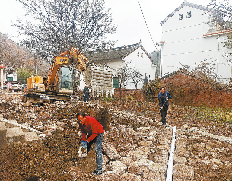 洛南县四皓街道马河村董王沟产业路于今年10月开工,长1100米,预计12月底前竣工投用。该条产业路的建成,将带动马河村林麝基地700多头林麝产业的可持续发展,年收入可达1100万元,以产业发展助力乡村振兴。图为12月11日,工人正在平整路基。