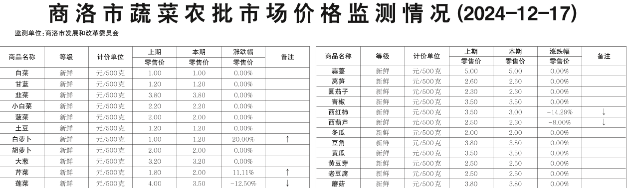 商洛市蔬菜农批市场价格监测情况(2024-12-17)