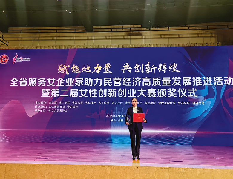 12月18日,陕西省第二届女性创新创业大赛在西安落幕,镇安县同舟济人力资源公司选报的“镇安采摘工”劳务品牌项目,从大赛初赛的332个项目经评选进入复赛,再以组别第四名的成绩冲入决赛,最终获得大赛三等奖。近年来,镇安县积极打造“镇安采摘工”劳务品牌,累计输出419批次3.2万人次,创收10亿多元,图为镇安县同舟济人力资源公司负责人刘娥在领奖台领奖。