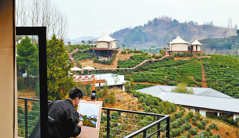 商南县秦岭茶乡旅游度假区项目总投资三点七亿元,新建改建茶园一点八万亩,配套建设观光路、茶园体验营地、自助茶屋等设施,带动就业两千多人。图为游客在翠绿的茶山间饮茶写生,享受惬意时光。(本报记者王江波摄)