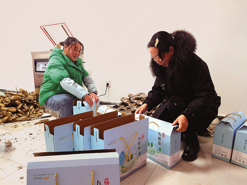 在孤山村党群服务中心旁的九眼莲种植基地里,十几名村民正忙着采挖九眼莲。他们每人负责一块区域,手中的铁锨起起落落,一锨接一锨,将淤泥轻轻翻起,节节莲藕似玉臂初露,柔滑细腻。