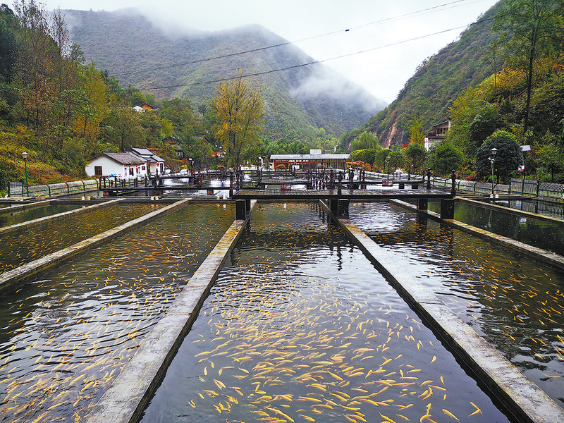 商南县左溪水产养殖有限公司的冷水鱼养殖基地12月23日,在商南县金丝峡镇太子坪社区的商南县左溪水产养殖有限公司的冷水鱼养殖基地,清澈的冷泉水在一排排长方形养殖池潺潺流动,一群群色泽光亮、动作敏捷的金鳟、虹鳟在池子里游来游去,不时有鱼儿跃出水面。