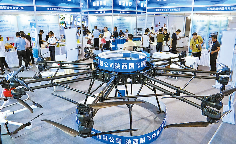 第八届丝博会上,陕西国飞领翼 科技有限公司展出的无人机。 (本报记者 王江波 摄)近年来,我市将无人机研发生产及应用作为发展电子信息产业主攻方向之一,外引内培、扩量提质、延展链条,推动低空经济快速发展,产业集聚效应和创新生态逐步形成,成为激活立体空间资源、加快发展动能转换的重要力量。