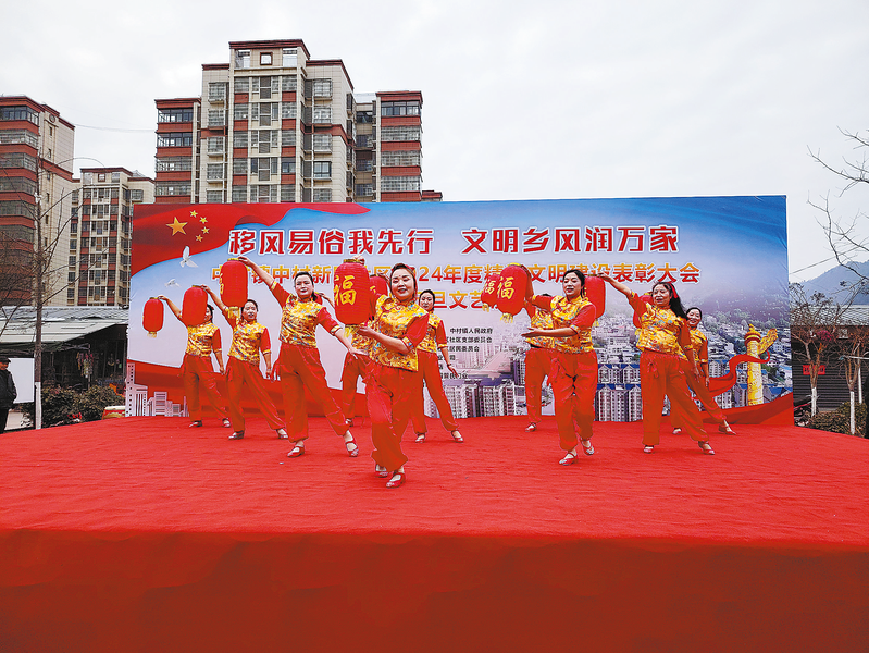 12月24日,山阳县中村镇中村新区社区举办“移风易俗我先行 文明乡风润万家”精神文明建设表彰大会暨文艺演出活动,表彰了一批“好儿媳、好公婆、好家庭”。社区干部群众500多人齐聚一堂,共享一场充满喜庆、祥和的文艺大餐。 (本报通讯员 齐 苗 摄)