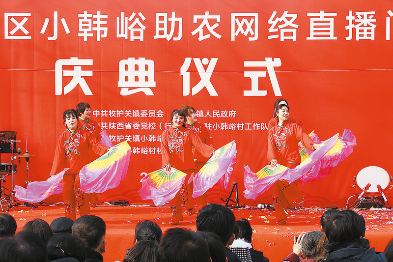 12月27日,商州区牧护关镇小韩峪直播大卖场开业。该卖场面积达680平方米,集农特产品展示厅、会客室、办公室、电子多功能厅、网络直播间及职工宿舍等区域于一体,将整合全区乃至全市优质农特产品,通过网络平台进行线上、线下销售。图为小韩峪村村民舞蹈队在开业仪式上表演舞蹈《开门红》。
