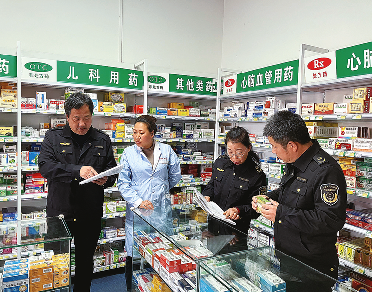 11月21日,市市场监管局执法人员在药店检查药品质量安全,查看记录台账。