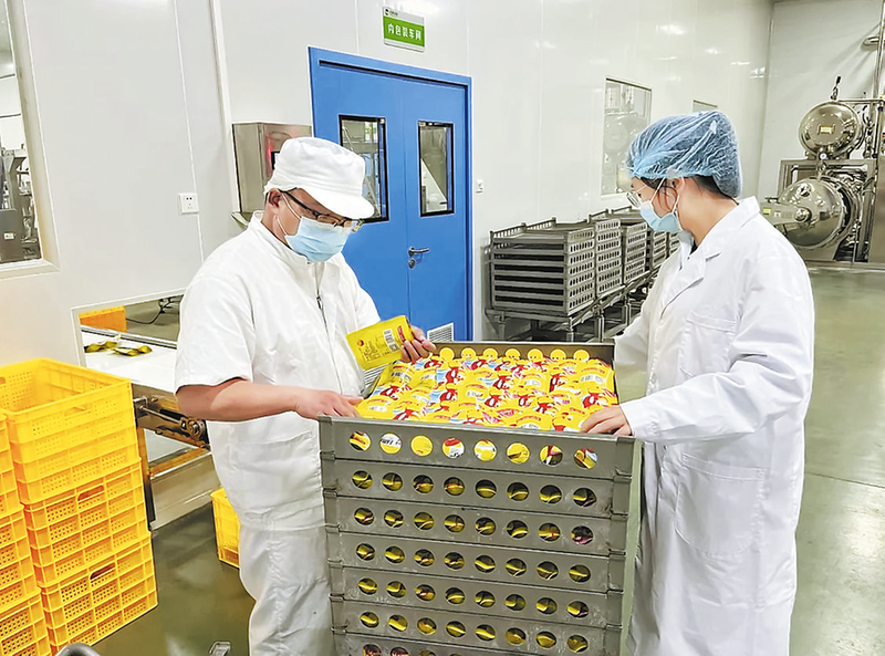 陕西合曼农业科技有限公司车间内,工人将罐装板栗摆 盘,预备进杀菌釜杀菌。高新技术企业是引领工业经济高质量发展的重要引擎。近年来,镇安县持续实施创新驱动发展战略,强化企业科技创新主体地位,通过加大政策宣传力度、精准服务指导、深化产学研合作、落实奖补资金等措施,不断激发企业创新活力,实现高新技术企业量质双提升。