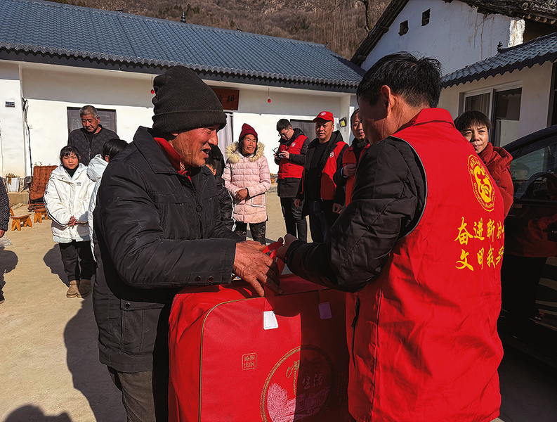 2024年12月29日,西安市助老爱幼公益慈善基金会、商州区巾帼志愿者协会等爱心志愿者来到商州区大赵峪街道桃园村,开展“寒冬送温暖”专项行动,为乡村困境老人、留守儿童送去棉被、大米、羽绒服等暖冬物资。 (本报记者 方 方 摄)