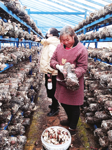 2024年12月26日,丹凤县竹林关镇王塬村食用菌产业园里,务工群众正在采摘香菇。据悉,该产业园有香菇大棚56个,发菌棚15个,带动本村及周边村民30多人在此务工,户均增收3000元。 (本报见习记者 孙远飞 摄)