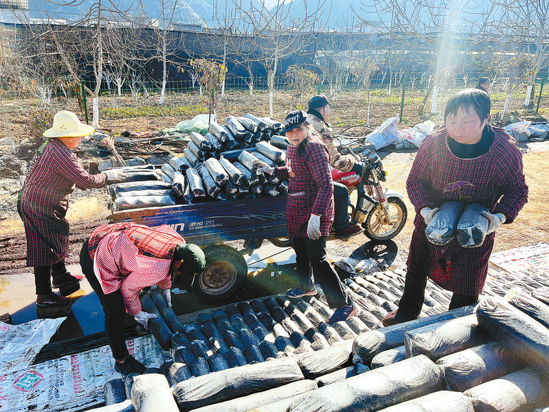 一月六日,在丹凤县竹林关镇张塬村滑子菇生产基地内,工人们正忙着将新的菌棒装车运往菌棒培育棚。据了解,该基地二O二五年计划年接种菌棒四十万袋,附近村民闲暇时间可通过在基地务工,实现家庭增收。(本报通讯员 王 蒙 摄)